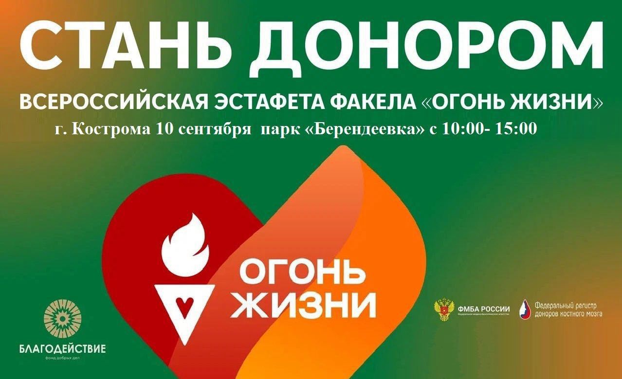 10 сентября в Костроме пройдут мероприятия второго этапа Всероссийской эстафеты факела «Огонь жизни». Эстафету запустили ФМБА России совместно с Фондом добрых дел «Благодействие» и Фондом поддержки социальных инициатив «Огонь жизни». В первом этапе эстафеты, объединившем более 50 городов, приняли участие свыше 84 тыс. человек, более 50 тыс. совершили донации крови, а Федеральный регистр доноров костного мозга пополнился на 8 тысяч потенциальных доноров.